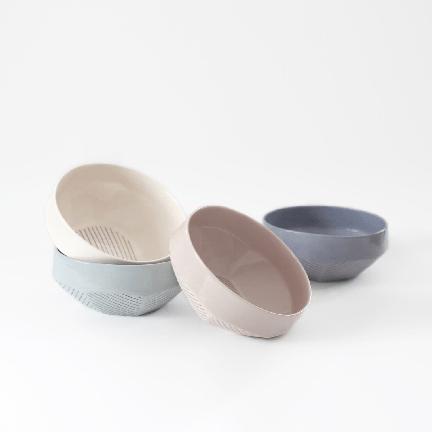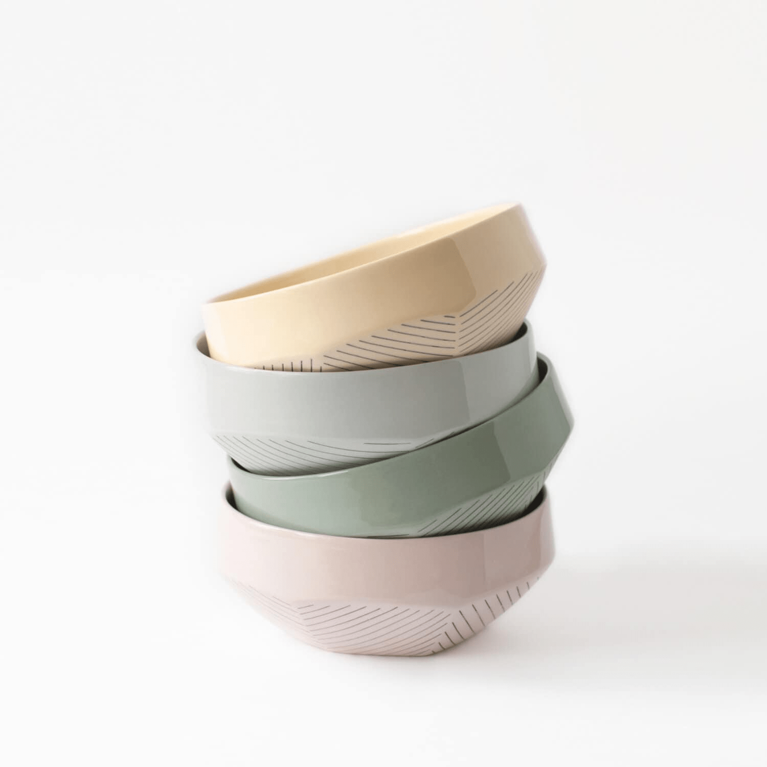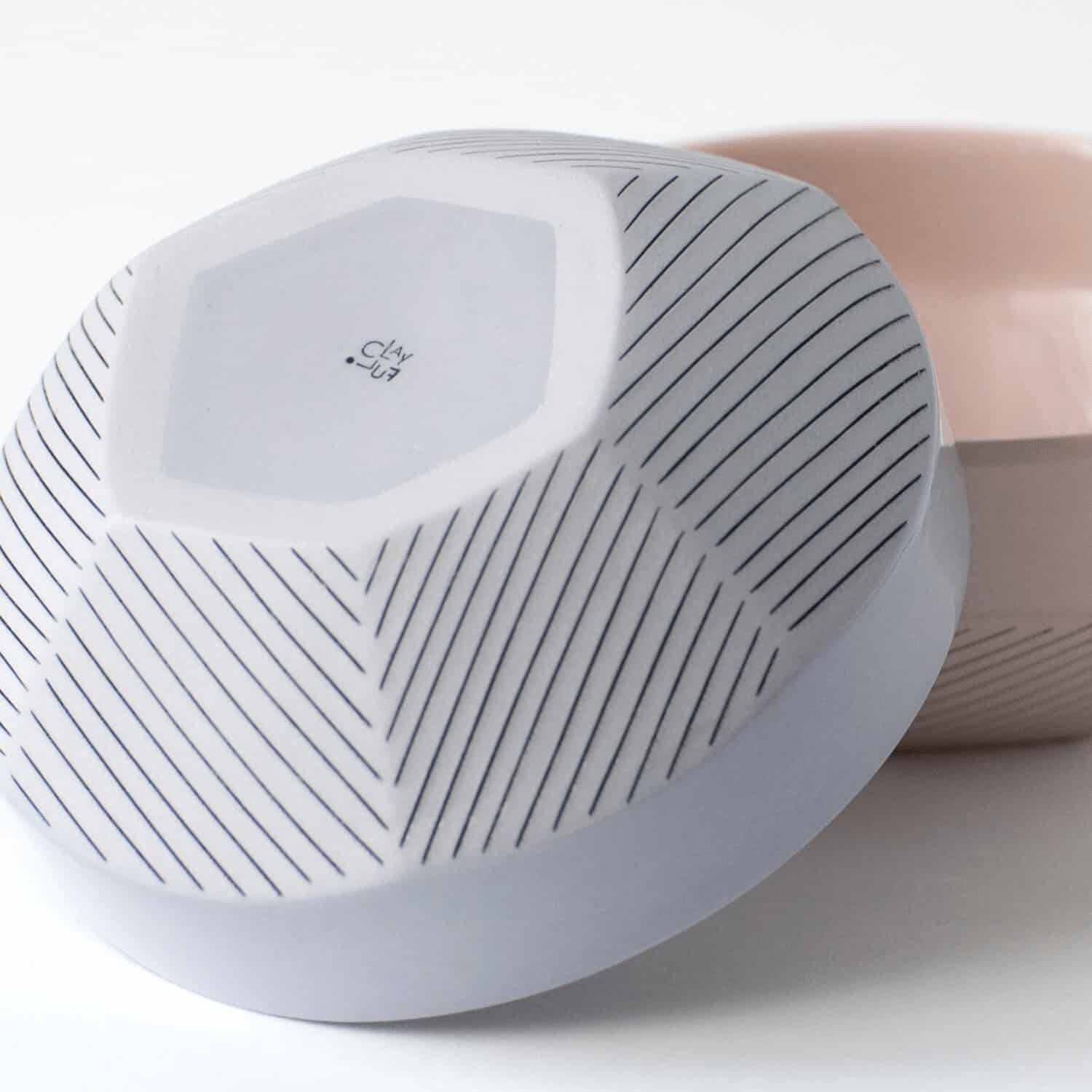 Pastelinių spalvų, geometrinių linijų dubenėlis, išsiskiriantis savo spalva ir dizainu.
